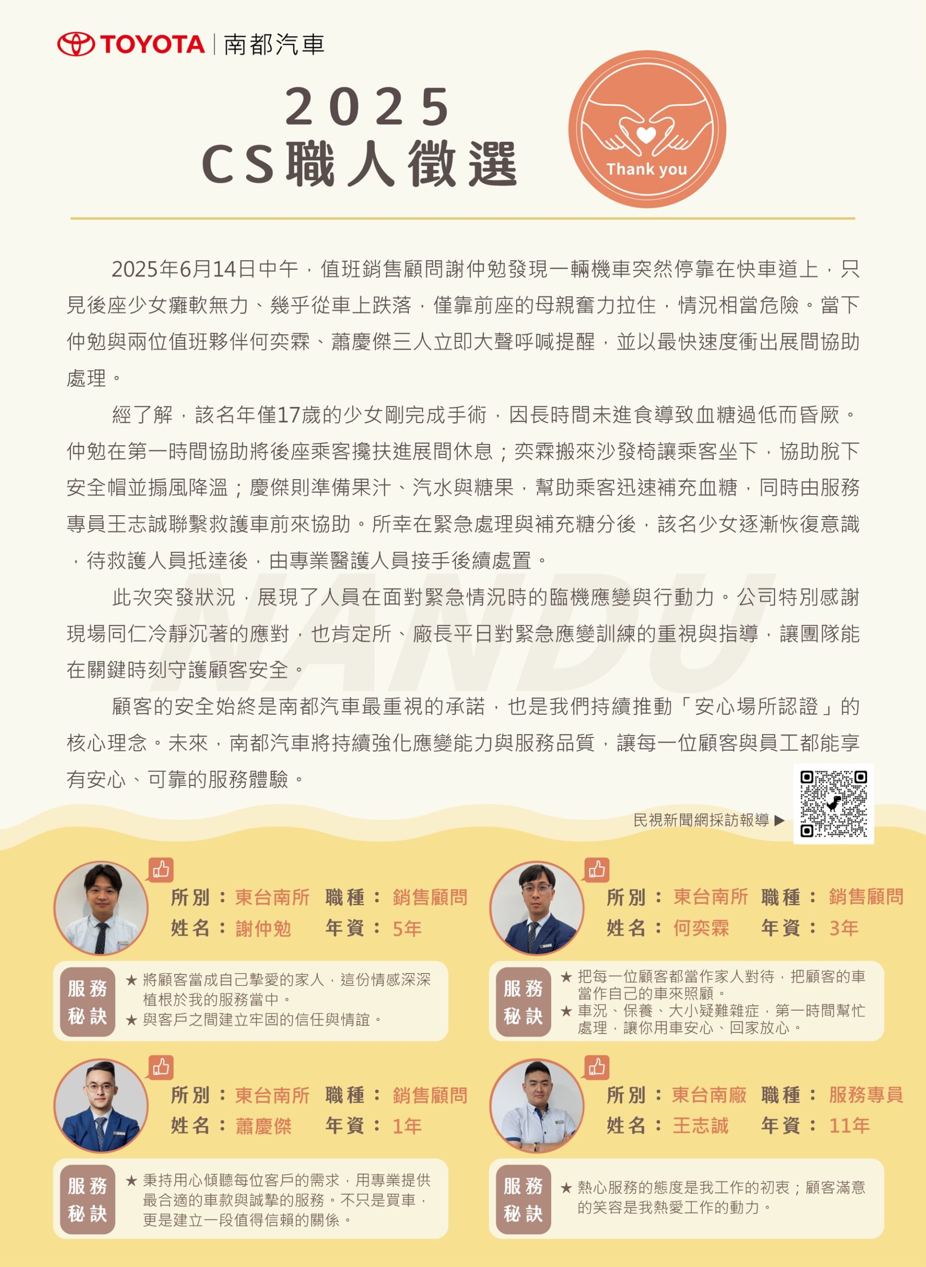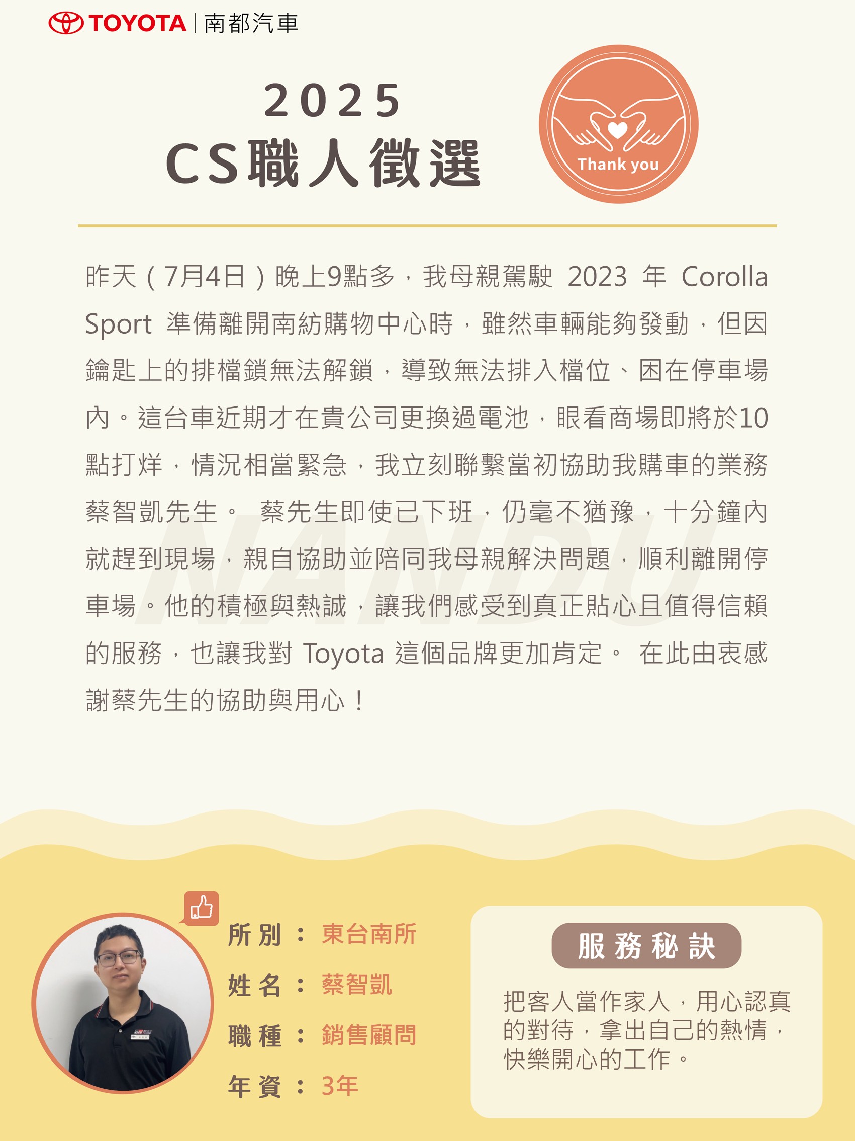 為持續鼓勵一線人員提升服務品質及滿意度,TOYOTA顧客關懷部彙整顧客回饋之讚揚內容,從中挑選出具代表性的優良案例,予以公開表揚。讓我們一起來透過這次的精選案例,感受夥伴們的服務精神與用心!