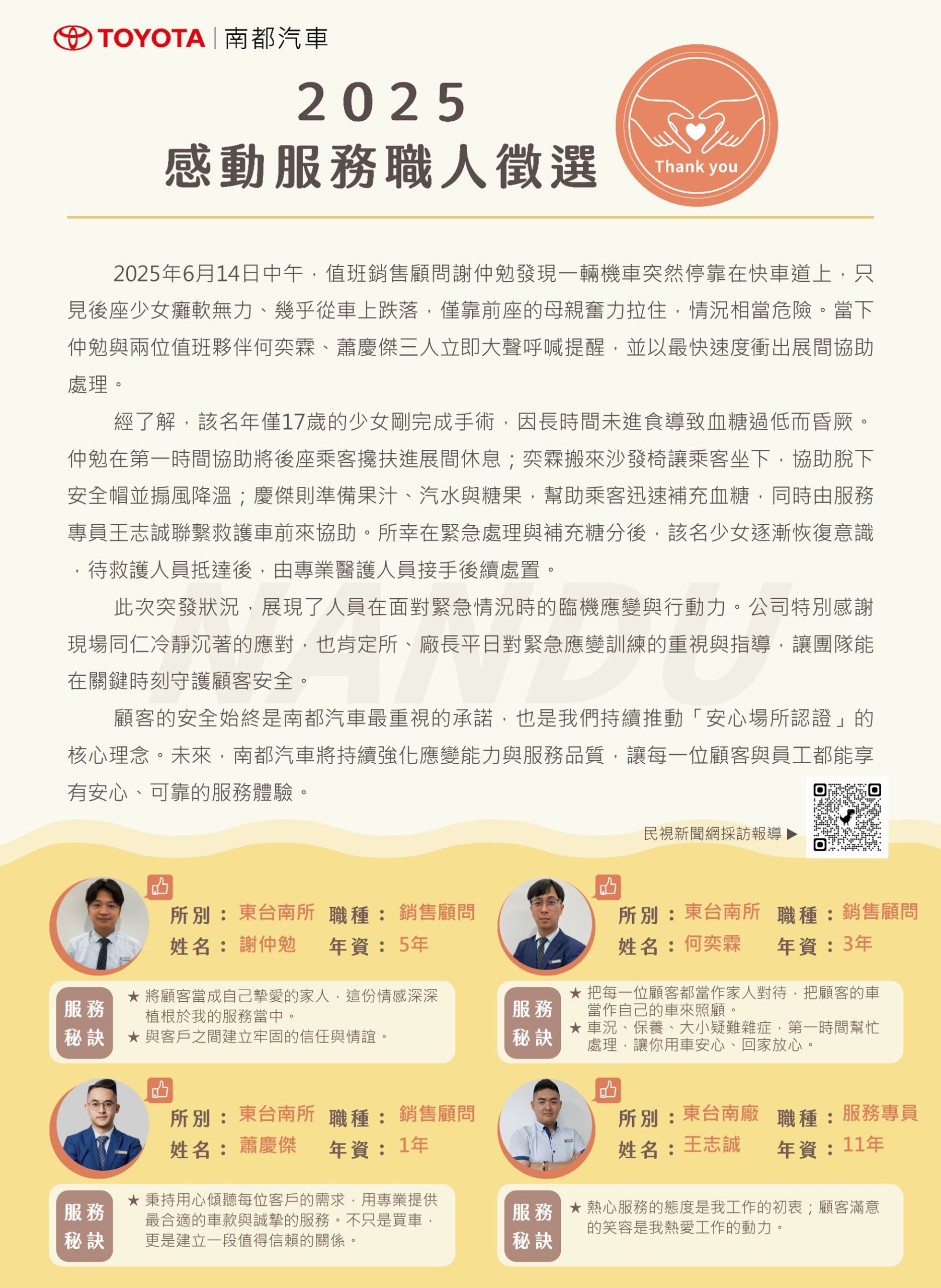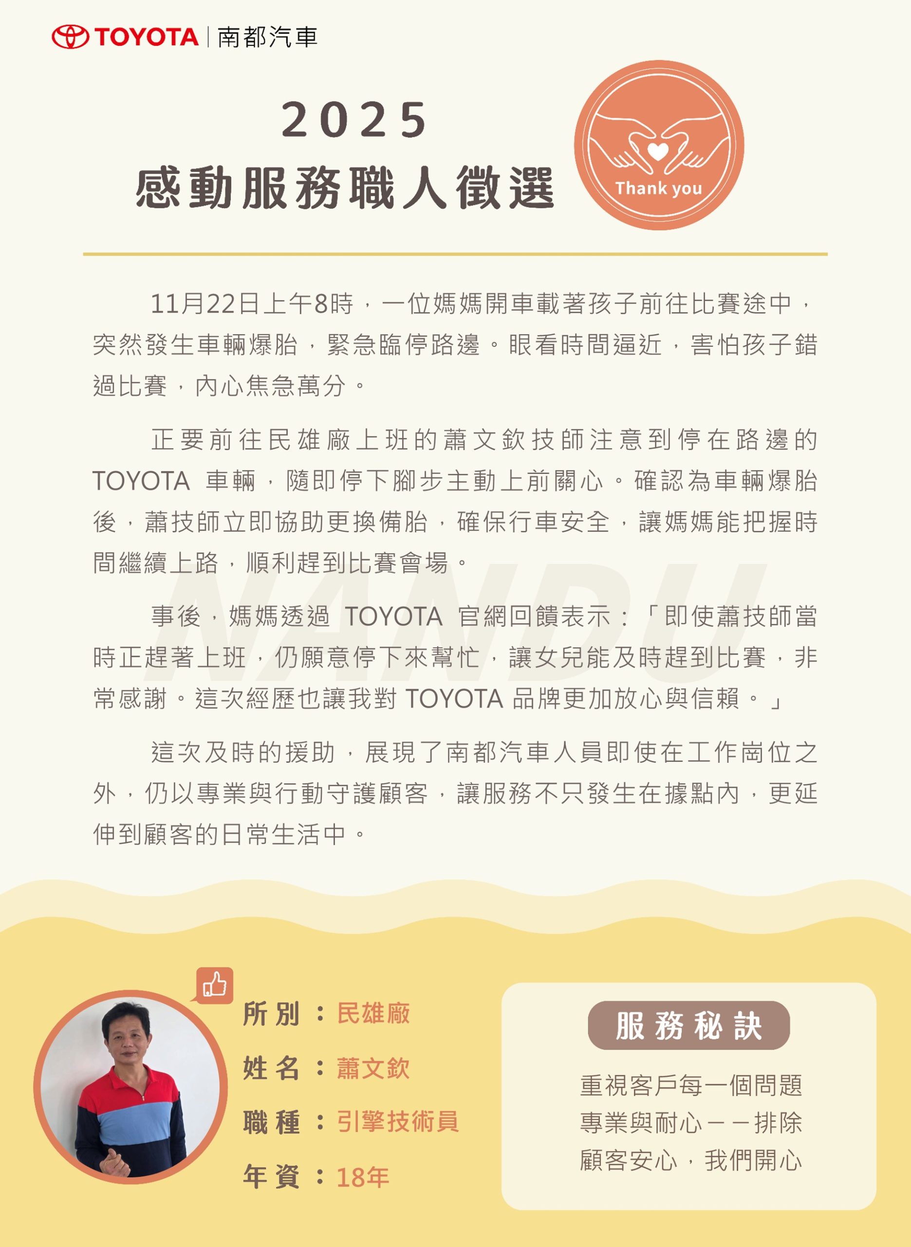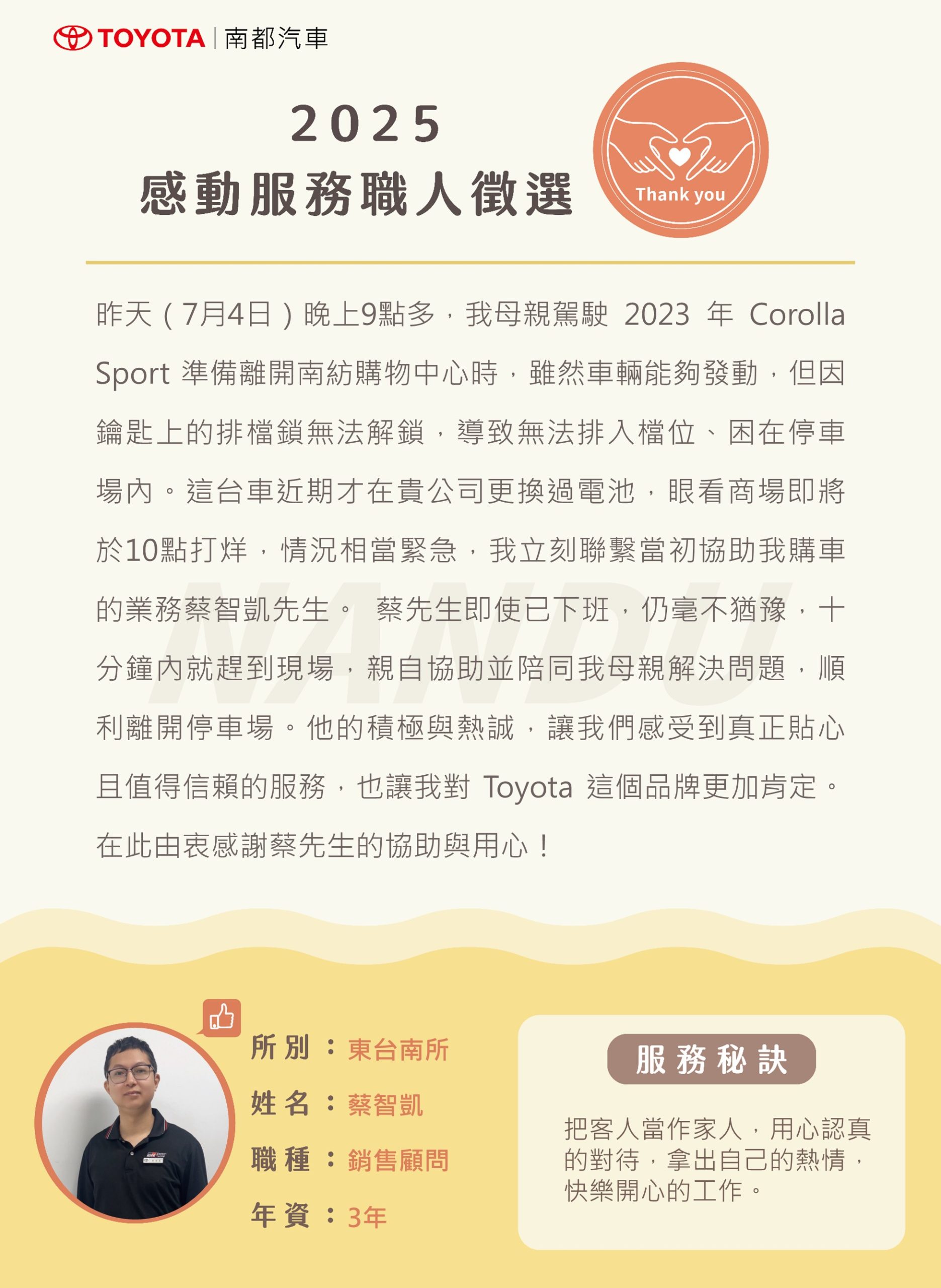 為持續鼓勵營業據點人員提升服務品質及滿意度,TOYOTA顧客關懷部彙整顧客回饋之讚揚內容,從中挑選出具代表性的優良案例,予以公開表揚。讓我們一起來透過這次的精選案例,感受夥伴們的服務精神與用心!